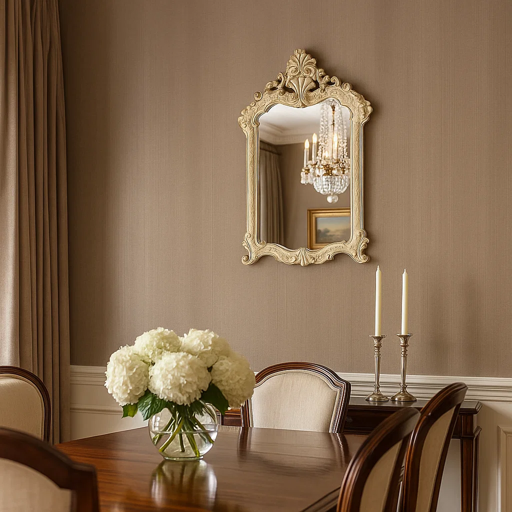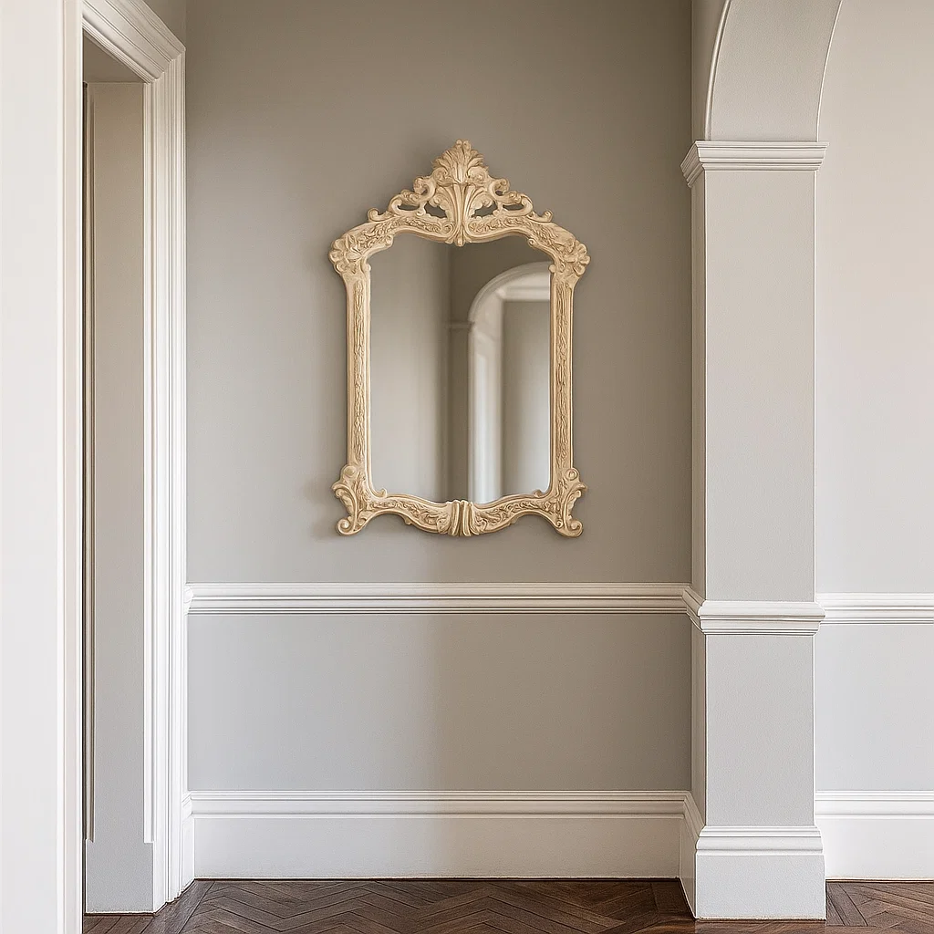 تُجسد مرايا كازابلانكا وايتي – 36×53 سم الطابع الكلاسيكي الأنيق بروح عتيقة راقية، حيث يتميز إطارها المزخرف بنقوش متقنة ولون أبيض عاجي يمنحها حضورًا فاخرًا يضفي على أي مساحة لمسة ملكية مميزة.